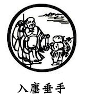 布袋様はお腹が大きく胸をさらけ出して、大きな袋と杖を持って跣で歩いていた。弥勒菩薩(みろくぼさつ)様の化身と言われる布袋様の姿を第十段階の境地に理想化して描いていると思われる。四弘誓願の中にある「衆生無辺誓願度」と「仏道無上誓願成」の誓願は仏菩薩の願いである。 仏道修行の目的はこの外には無い。灰頭土面の働きはやろうとしてやるのではなく、そうしないではいられない慈悲心(利他の心)が自然に現れることを歌っている。「入店垂手」の境地に至った人は、枯れ木のように精神に生気が無くなった人にも、新たな生命を吹き込んで花を咲かせるような力を持つと言う。全く人の思惑や体裁を考えず、自分をはだかにして何のはからいも無く、行動する。一般大衆の中に混じって話をし、手を差し伸べる。 人の思惑や体裁を考えず、自分を裸にして何のはからいも無く行動する姿を歌っている。よく布袋様(ほてい)(中国の伝説的禅僧:七福神)が描いてある。