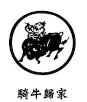 牛を飼いならした旅人が、その牛に乗って家に帰る場面です。旅人は、見つけた牛(目標)を何とかつかまえ、飼いならしていくうちに、牛と自分がぴったりと、ひとつのものになっていることに気づきました。絵には、牛の背中で笛を吹いている旅人の姿が描かれています。手綱もにぎらずに、牛の進むにまかせています。その行き先は、彼らの家です。自分たちの本来いた場所に、戻っていくのです。