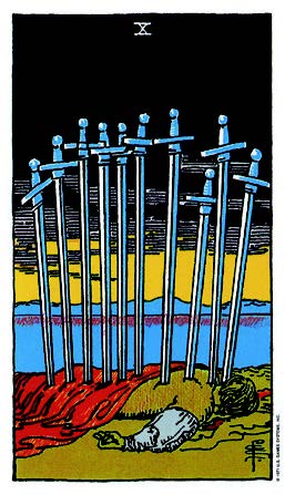 水辺の描かれた剣のカードは、剣の示す理性と水の示す感情とのバランス、心理の世界を意味する。剣10は心の死を示す。