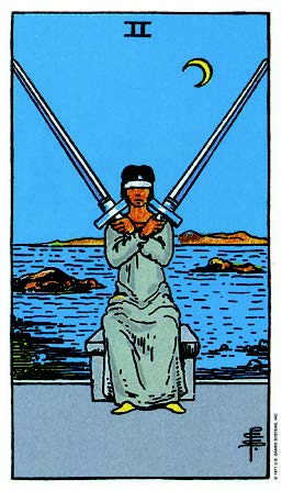 水面(水=感情)と空(風=理性)の割合はちょうど彼女の胸のあたりで、二本の剣と共に調和しています。それは、理性と感情の調和による平安を示します。