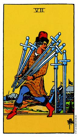 物事を照らし出す黄色が窃盗を明らかにしています。剣7が占う最初のカードで出た場合、占う内容に嘘がある場合があります。